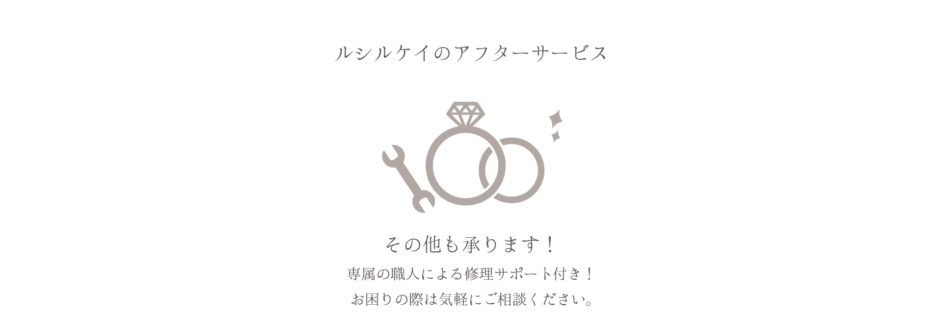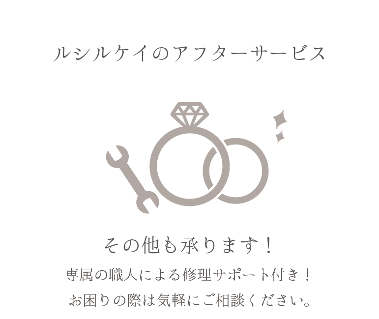 まずは、ご注文いただいた指輪をしっかりとお造りし、ご納品させていただくことをお約束いたします。ご納品時に万が一不具合やサイズが合わない場合は、保証外で無料で修正いたします。そして、1年後3年後の対応はもちろん、サイズ直しなどは10年後20年後がどうか?が肝心です。ルシルケイグループでは安心してご利用頂く為に【ルシルケイサポートサービス】+【ブランドアフターメンテナンス保証】をご用意しており、安心、万全の体制を整えております。