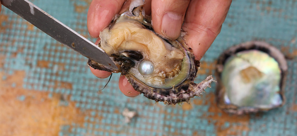 真珠の芯となる核を母貝に入れる作業は、春から夏にかけておこなわれ、高度な技術を要する核入れは、熟練の職人がひとつひとつ手作業で行います。核を入れた母貝はそれを包む真珠袋を形成し、海中で美しい真珠が誕生します。