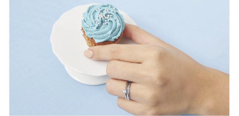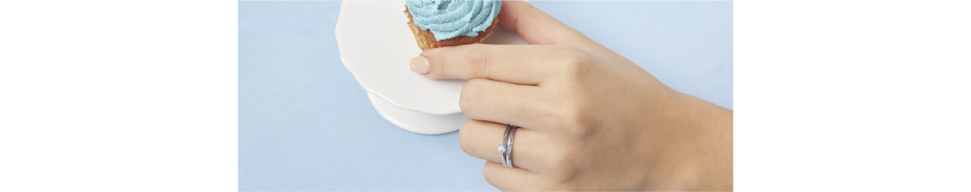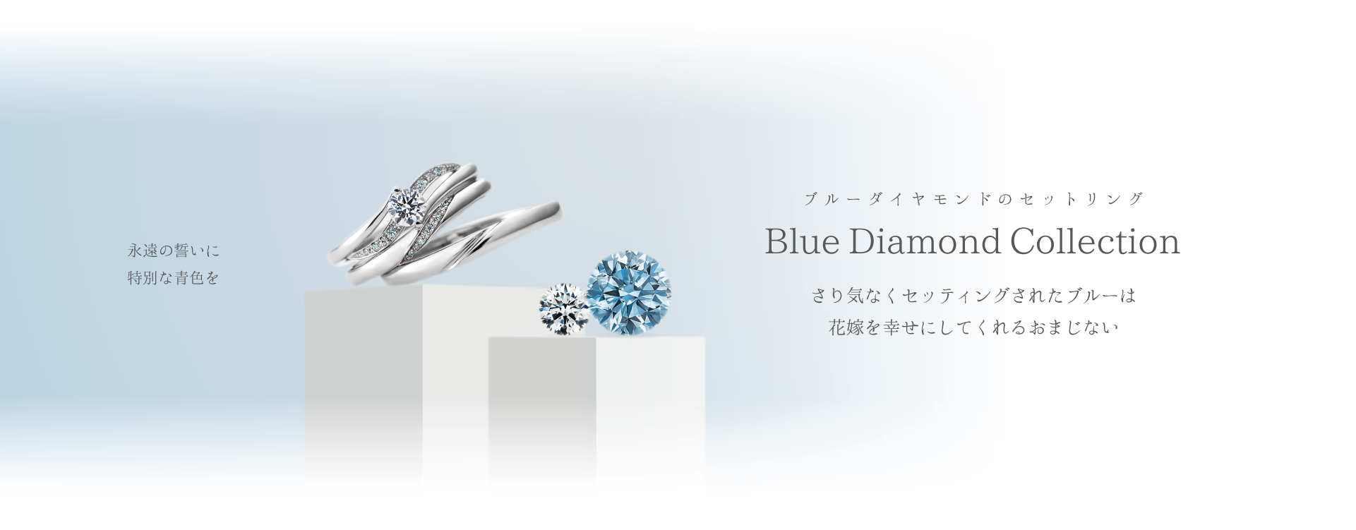 透明感あふれるダイヤモンドの輝きに、ほんのりと優しい青を添えたブルーダイヤモンド。セットリングの中にそっとセッティングされたブルーは、花嫁が幸せになれるおまじない “サムシングブルー” を意味しています。