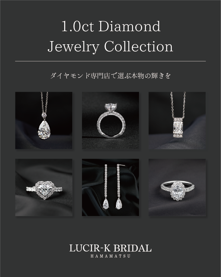 確かな品質と、選び抜かれた1石を。LUCIR-K BRIDAL浜松がご提案する、1.0ctダイヤモンドジュエリーは、写真や数値だけでは伝わらない、圧倒的な存在感。身に着けた瞬間、違いを実感できるのが1.0ctダイヤモンドです。人生の節目にふさわしい輝きを、実物を見ながらお選びいただけます。