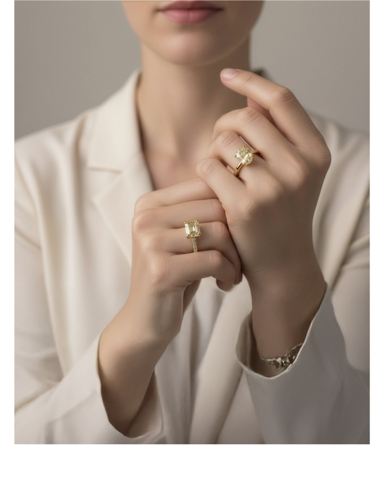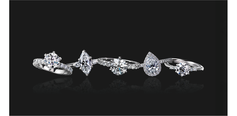 小判型をしたオーバルカットやしずく型ペアシェイプカットなど、多彩なフォルムが魅力のファンシーカットダイヤモンド。カットごとに異なる表情を見せ、個性と洗練を際立たせます。直線的な美しさや柔らかな曲線が、装う人の美意識を映し出し、唯一無二のスタイルを完成させる存在です。