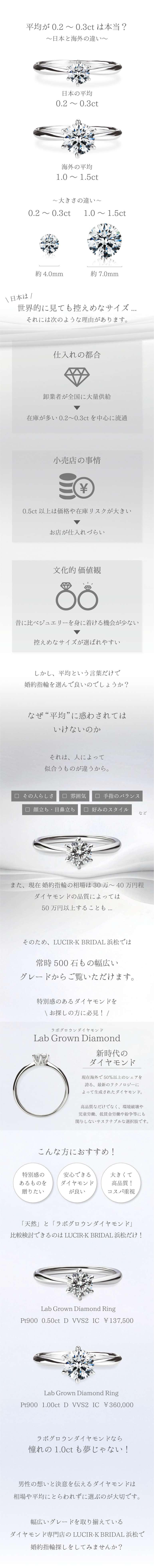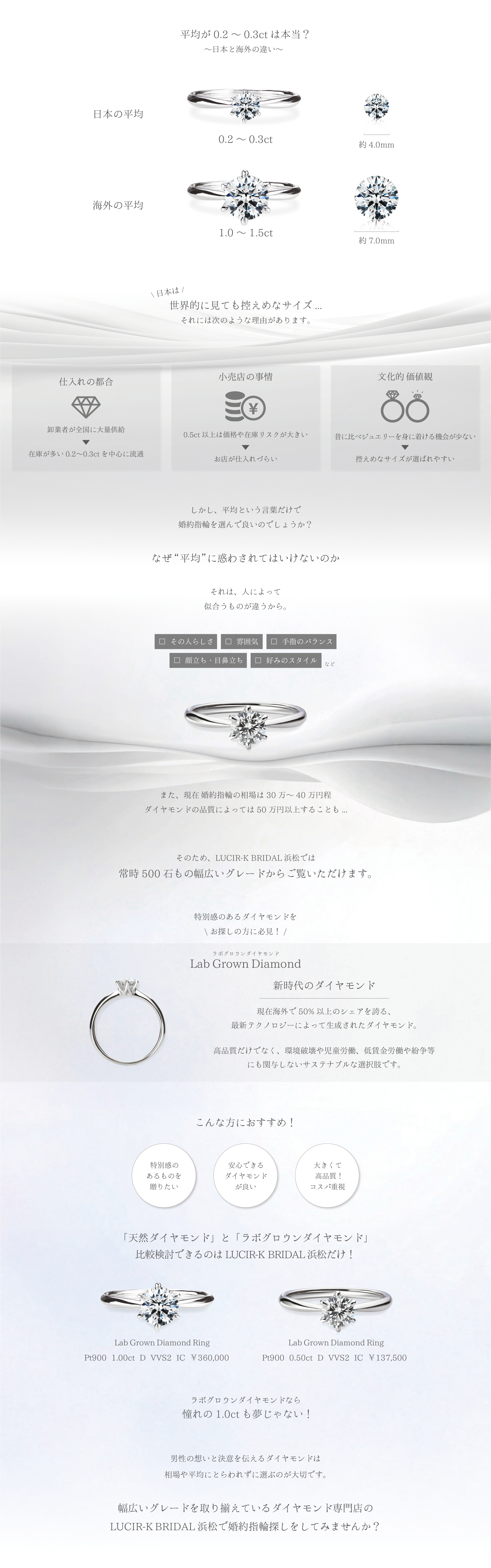 婚約指輪の主役ともいえるダイヤモンド。同じご予算でも「選び方」で大きく見え方や満足度が変わります。 そのような中でどのお店でもダイヤモンドの大きさは0.2〜0.3ctが平均と案内されますが、はたしてそれは何をもって"平均"とされているのでしょうか?