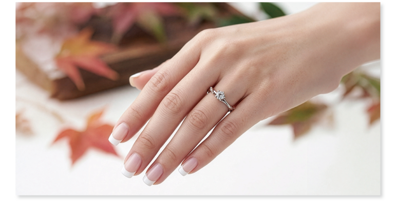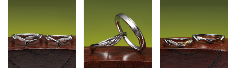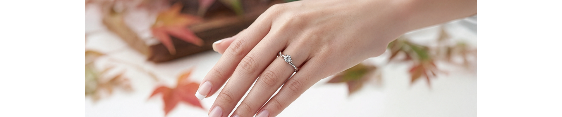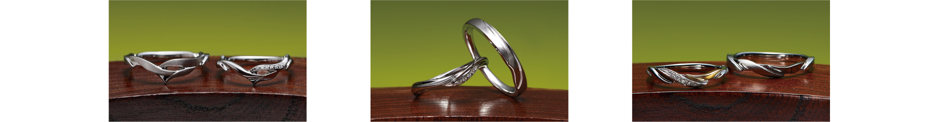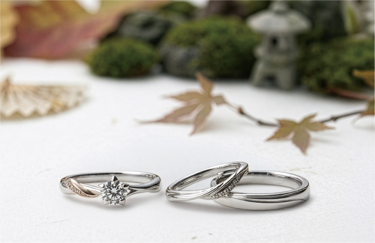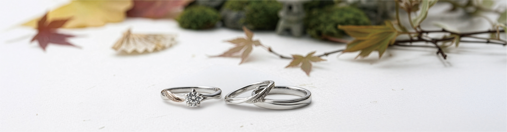 やわらかな陽射しとともに、木々が色づき始める秋。実りの季節でもあるこの時期は、穏やかで落ち着いた時間が流れ、おふたりの関係をより深く感じさせてくれます。移ろう景色の美しさとともに、心に残る情景を指輪に込めました。