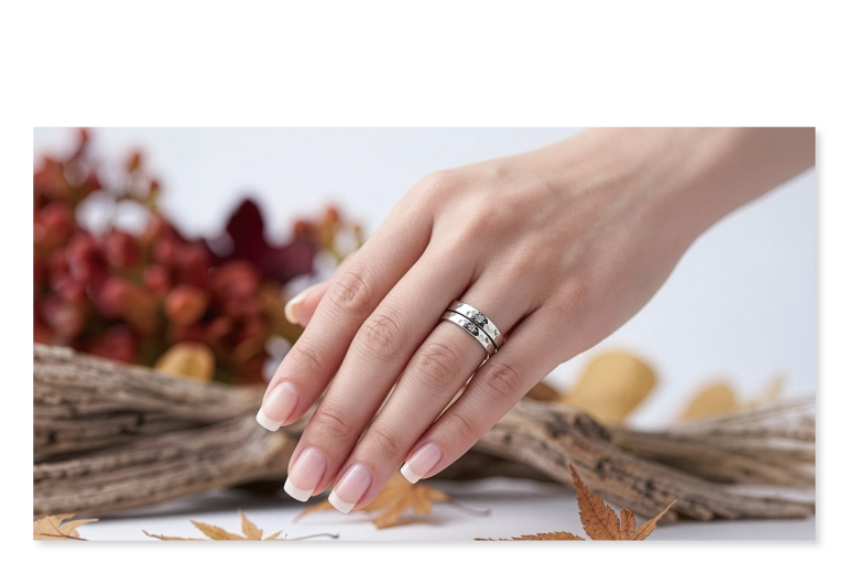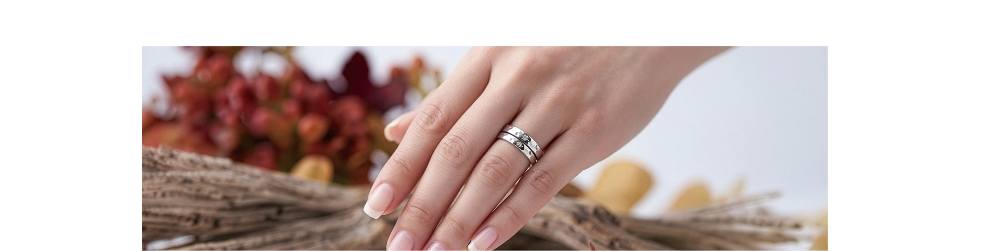 萬時の結婚指輪は、紅葉や実り、やさしい光といった秋の風情を繊細に表現しています。温かみのある色合いや落ち着いた印象の意匠が、日常に上品な趣を添えます。自然の移ろいを感じられるデザインが、身に着けるたびに心を穏やかに整えます。