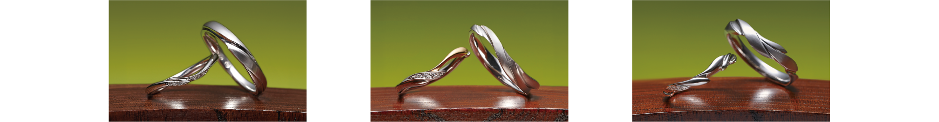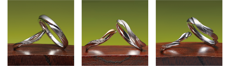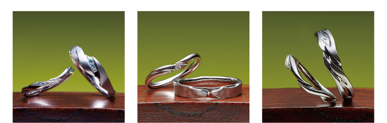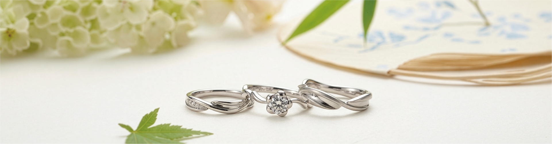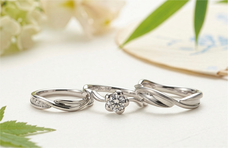 萬時の結婚指輪は、夏の光や水、自然の躍動感を繊細に映し出した意匠が魅力です。明るく伸びやかな印象のデザインは、日常の中にさりげない華やかさを添えます。自然の美しさを取り入れた造形が、身に着けるたびに季節の記憶を呼び起こします。