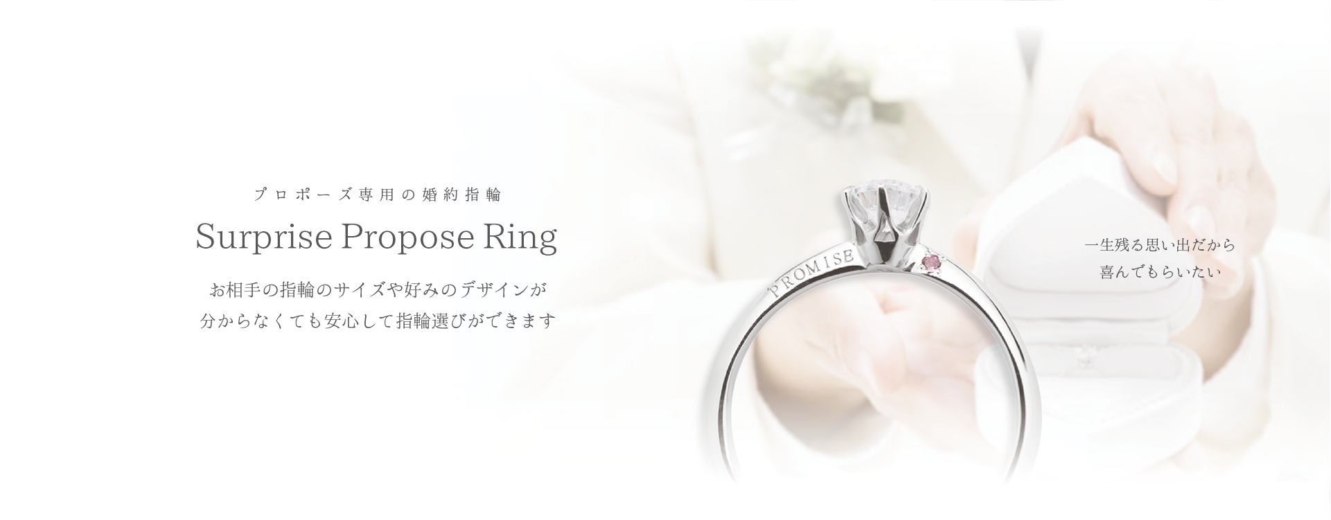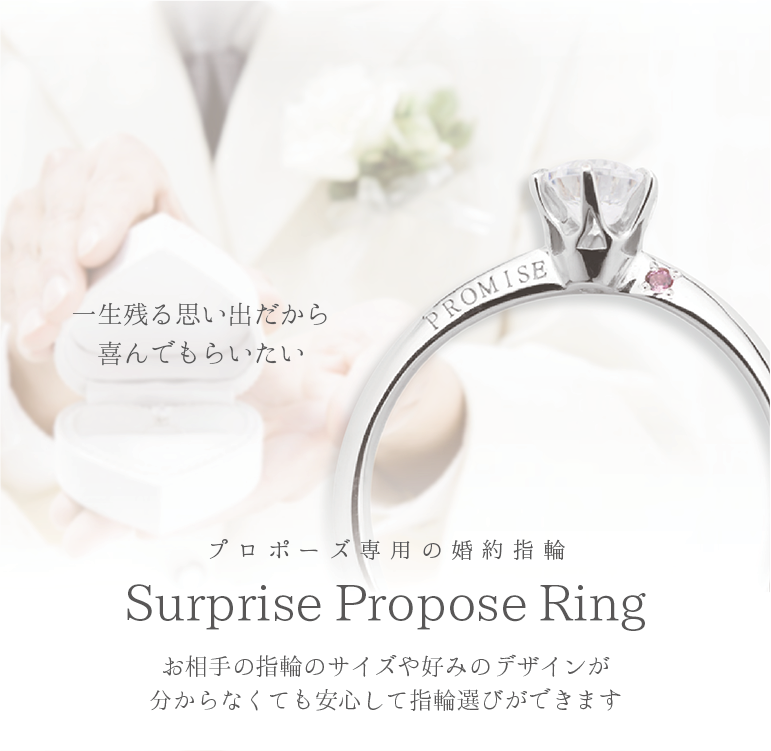 サプライズプロポーズならお任せください!プロポーズ相談室を設け、プロポーズのシチュエーションや渡し方、指輪の着け方までサポートさせていただきます。一生に一度のプロポーズ、彼女様にとびっきりのサプライズしてみませんか?