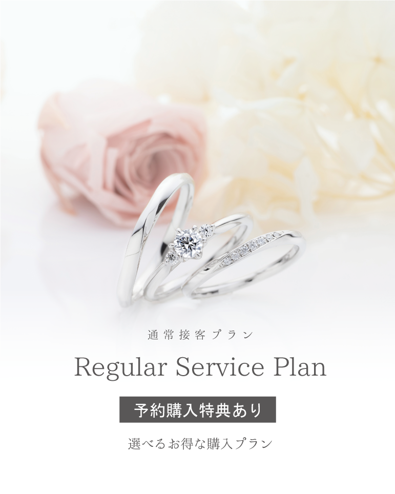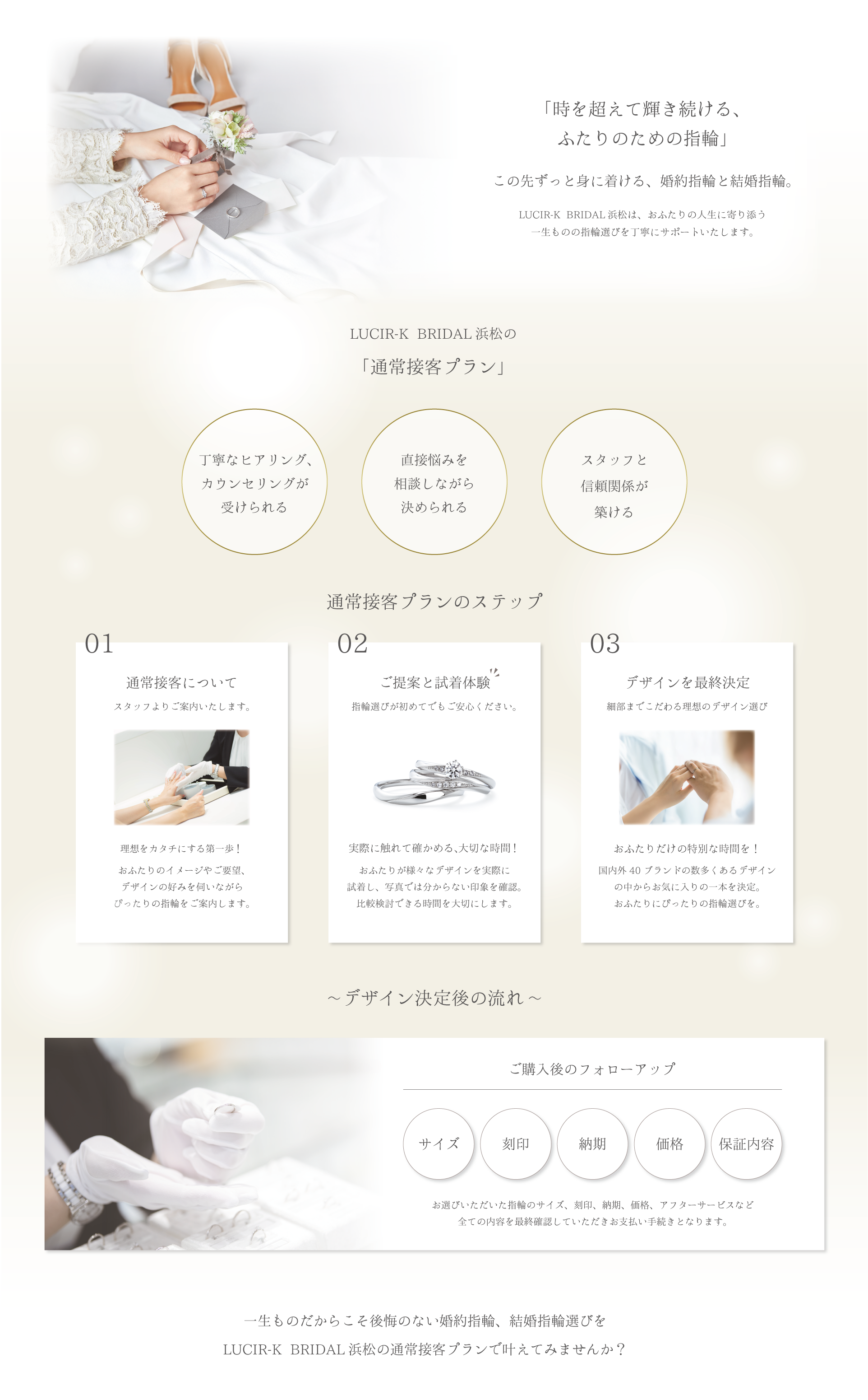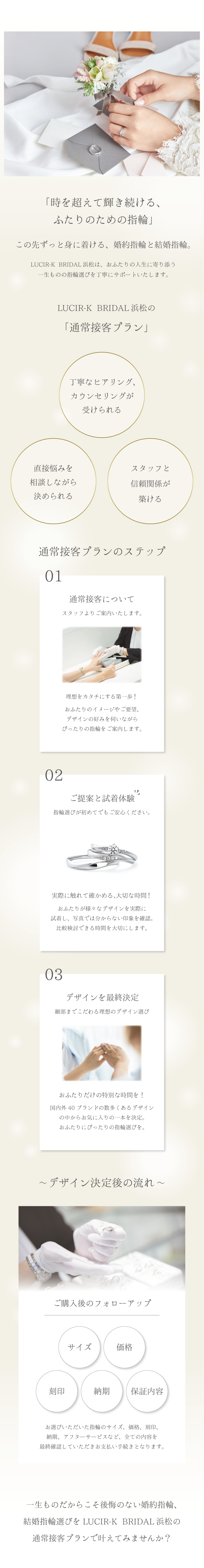 LUCIR-K BRIDAL浜松の「通常接客プラン」は、経験豊富な専門スタッフが最初から最後まで丁寧にご案内する安心のプラン。デザインやダイヤモンドの特徴、着け心地まで一つひとつ確認しながら、理想のリング選びをお手伝いします。指輪選びに不安がある方や、じっくり相談しながら決めたい方におすすめです。