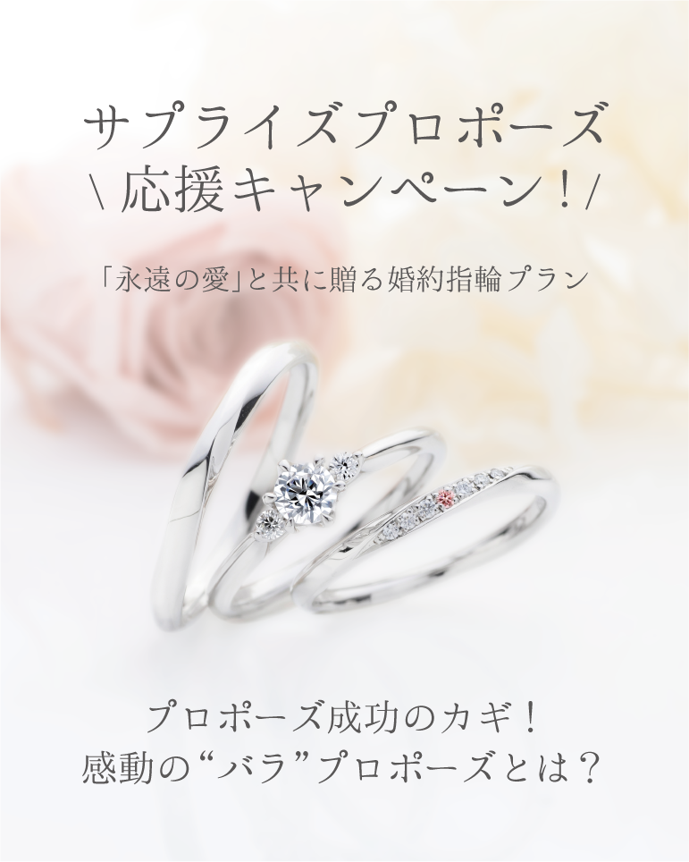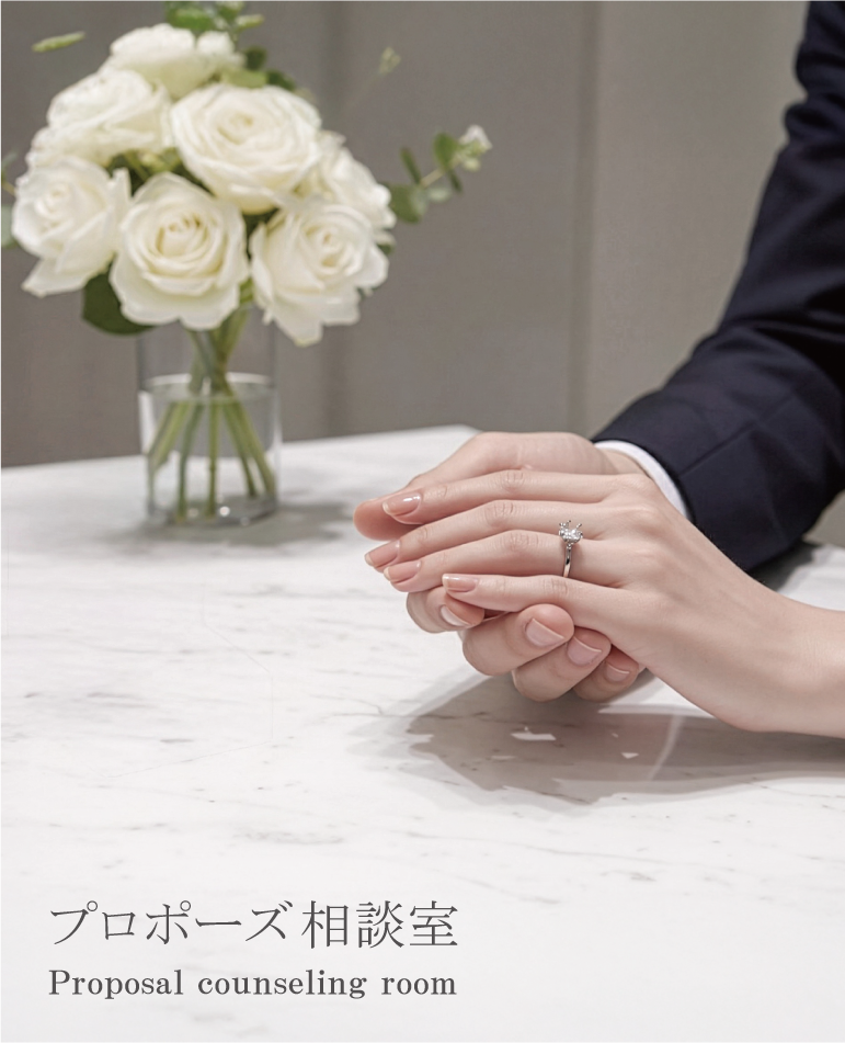 大切な彼女の心に、一生の思い出としてのこるようなプロポーズになるよう、プロポーズアイテムやシチュエーションのご提案、婚約指輪の適した購入の方法など、様々なご提案をしております。プロポーズ相談室では、プロポーズを考えている彼をサポートいたします。