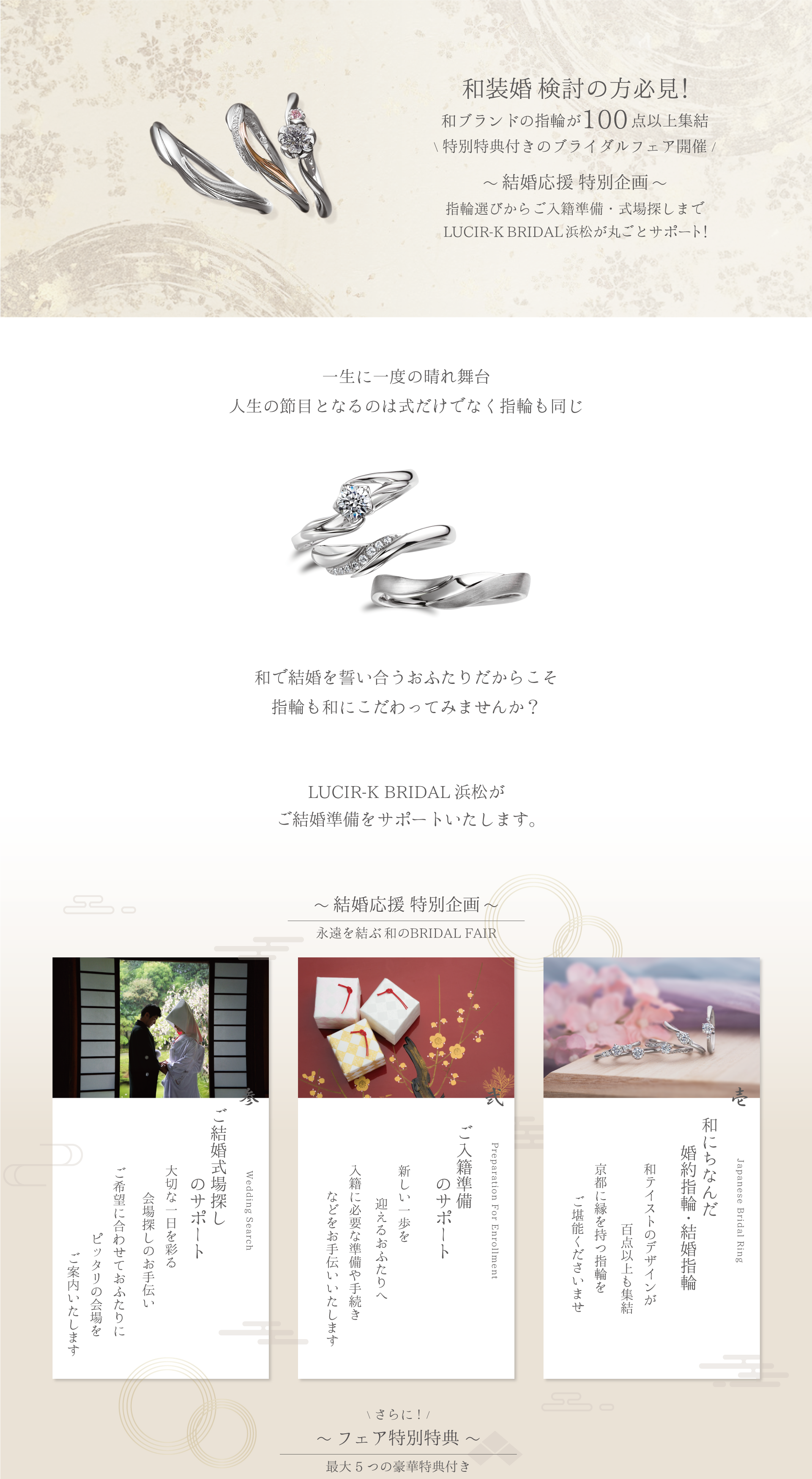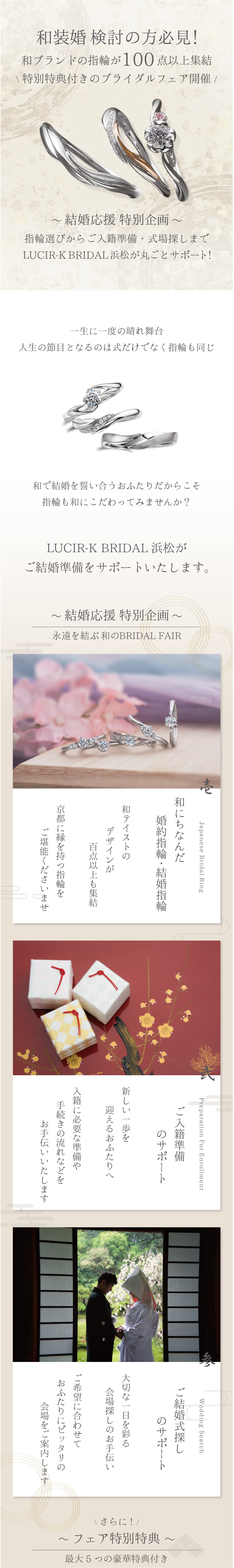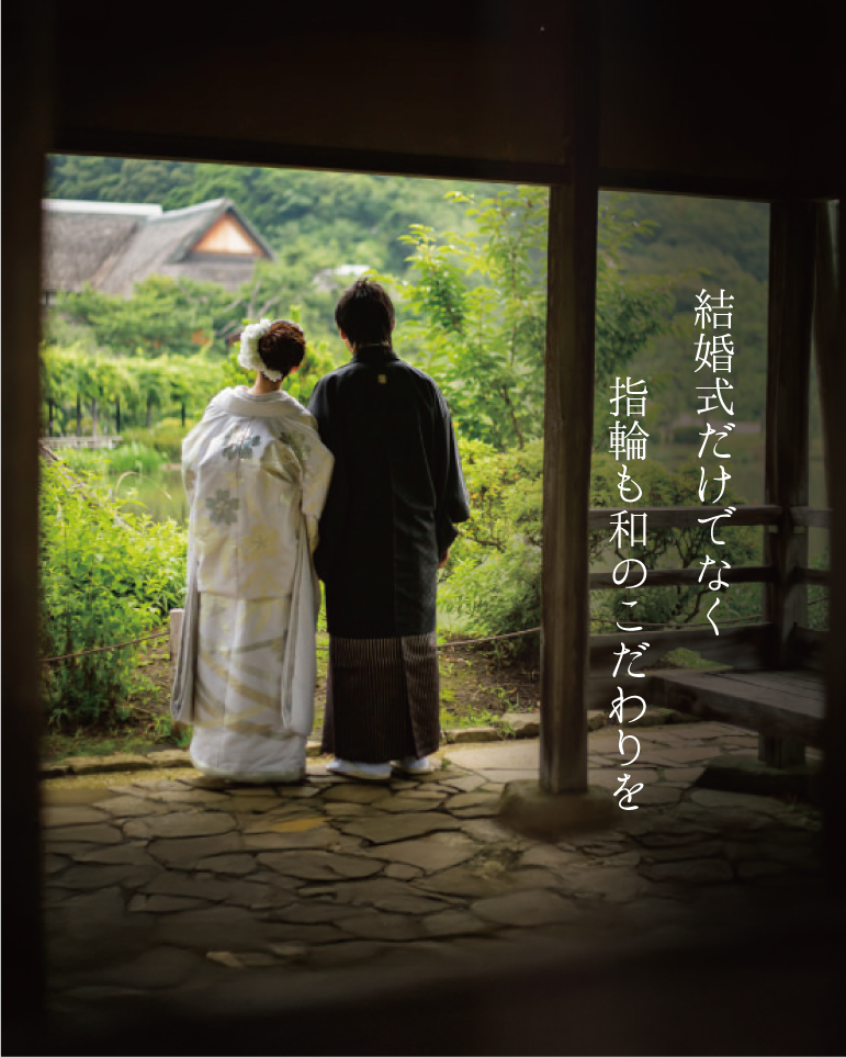 和の結婚式を検討中の方へ。京都発の和ブランドをはじめ、100点以上の和テイストの指輪が一堂に集結。さらに特別特典や結婚式場探しサポートもご用意。ご入籍準備までまるごと応援する限定フェアです。